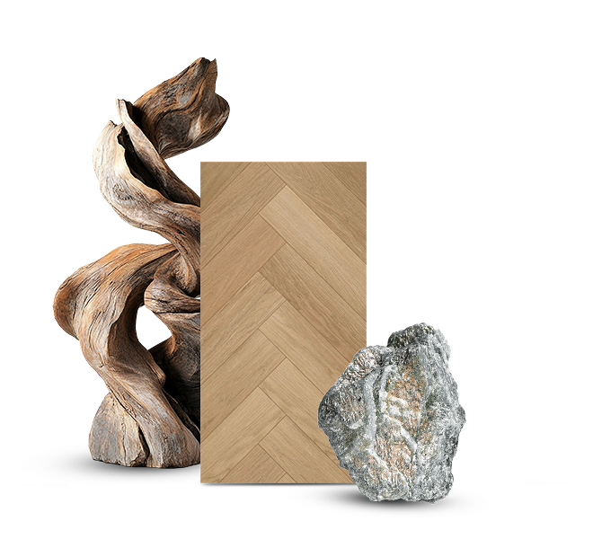 Плашки на торцах обрезаны под углом 45°, чтобы при укладке соединиться в чёткий V-образный рисунок. Геометрия укладки «шевроном» создаёт атмосферу порядка и гармонии, а торжественный ритм рисунка напоминает о величии залов Версальского дворца.