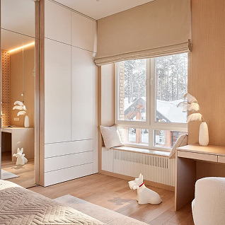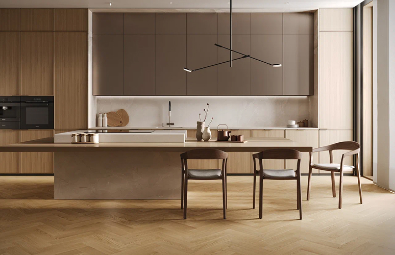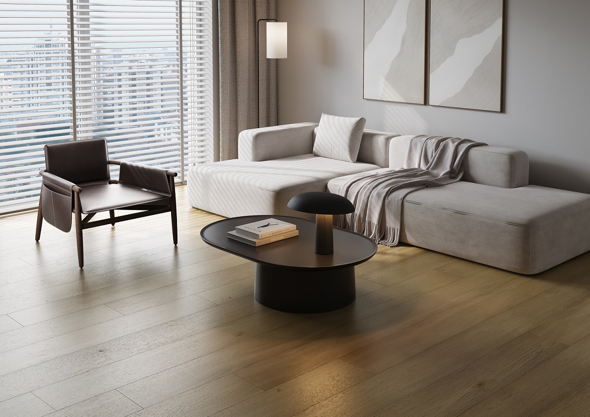 Кварцпаркет, уложенный без порогов, подчёркивает линии интерьера и дарит помещению цельную эстетику.