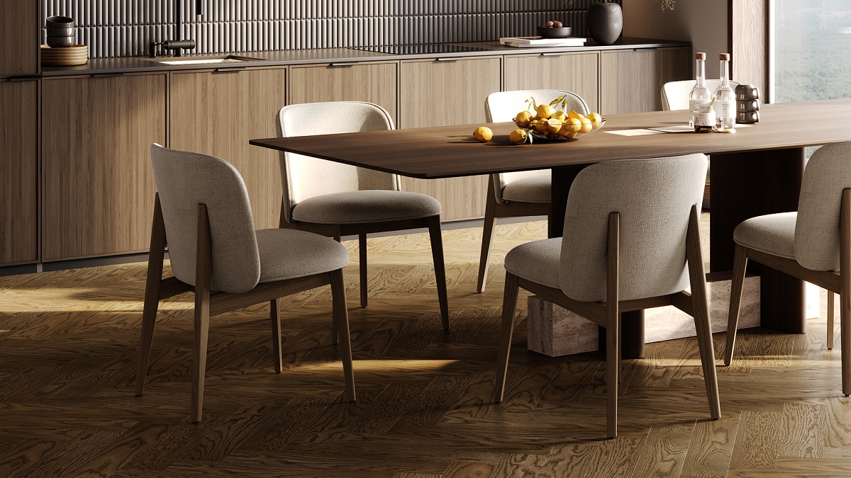 Уложенный ёлочкой, кварцпаркет из ценной породы дуба раскрывается динамичным игривым рисунком.