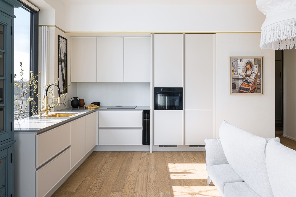 Передо дизайнером Анной Исуповой встала задача найти компромисс между архитектурой современного ЖК, ритмами большого города и привычкой заказчиков жить за городом неспешной и размеренной жизнью, их любовью к малой родине. Поэтому основа проекта стала лаконичной и современной подстать локации и видам из окон. И в эту канву умело вплели историю о любви к природе, традициям, искусству, семейные ценности и рассказы о путешествиях.